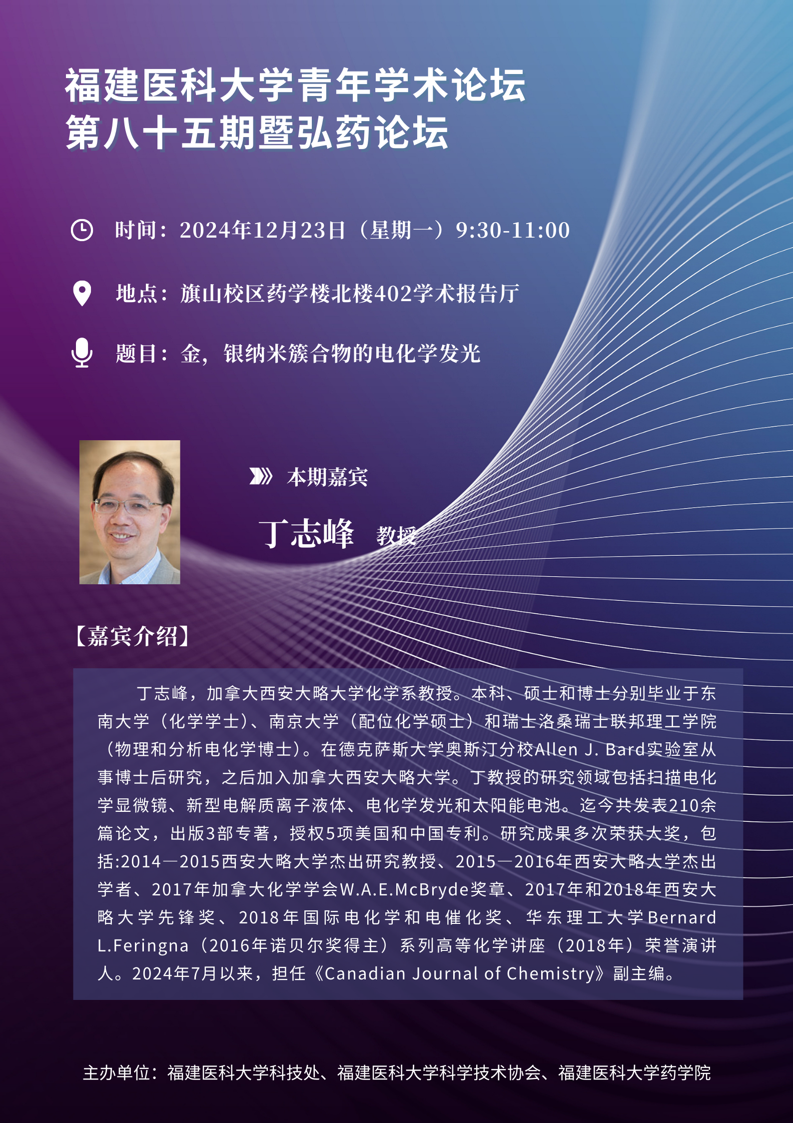 丁志峰,加拿大西安大略大学化学系教授。本科、硕士和博士分别毕业于东南大学(化学学士)、南京大学(配位化学硕士)和瑞士洛桑瑞士联邦理工学院(物理和分析电化学博士)。在德克萨斯大学奥斯汀分校Allen J. Bard实验室从事博士后研究,之后加入加拿大西安大略大学。丁教授的研究领域包括扫描电化学显微镜、新型电解质离子液体、电化学发光和太阳能电池。迄今共发表210余篇论文,出版3部专著,授权5项美国和中国专利。研究成果多次荣获大奖,包括:2014—2015西安大略大学杰出研究教授、2015—2016年西安大略大学杰出学者、2017年加拿大化学学会W.A.E.McBryde奖章、2017年和2018年西安大略大学先锋奖、2018年国际电化学和电催化奖、华东理工大学Bernard L.Feringna(2016年诺贝尔奖得主)系列高等化学讲座(2018年)荣誉演讲人。2024年7月以来,担任《Canadian Journal of Chemistry》副主编。