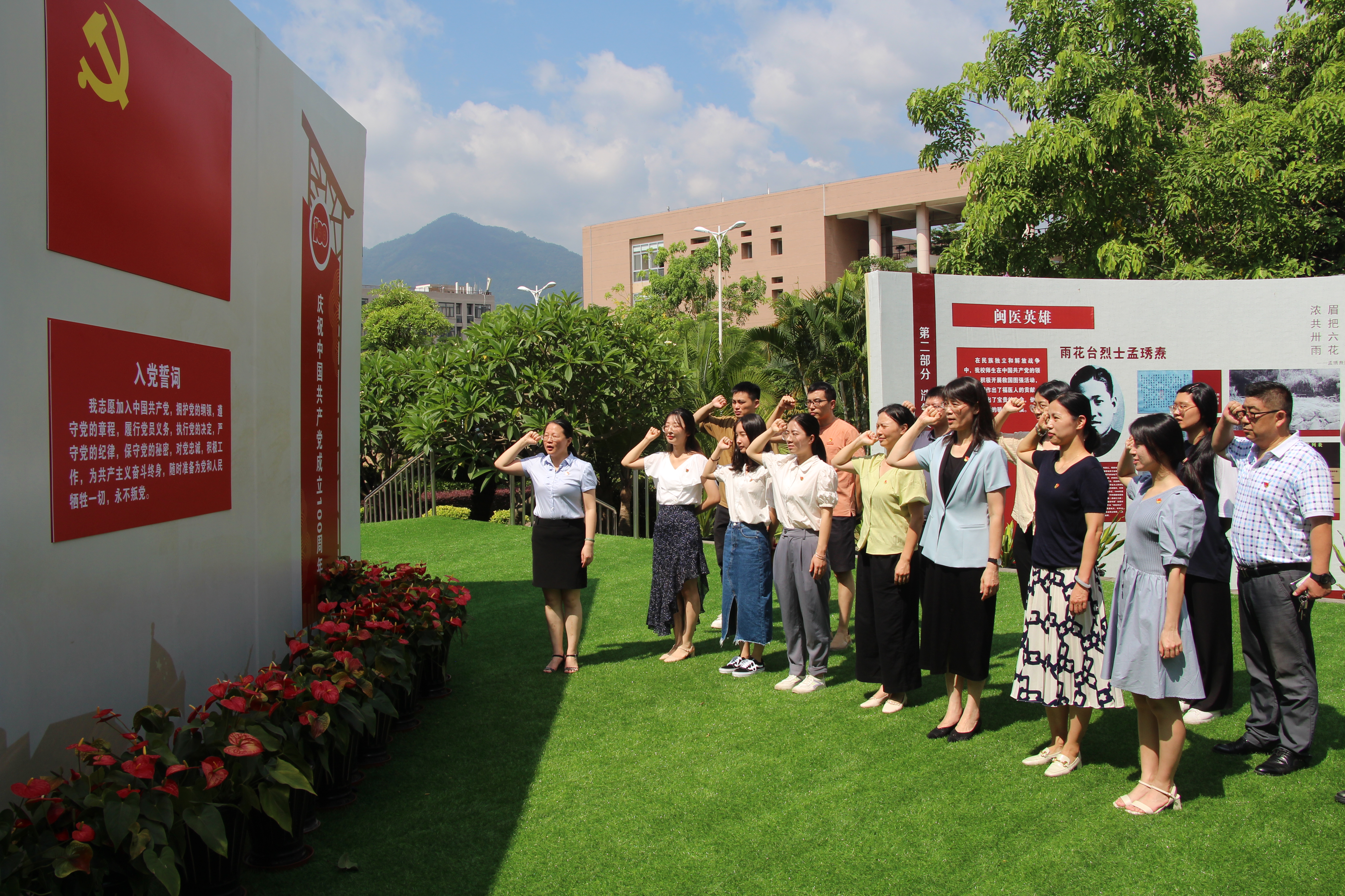 展区分首设党支部、浩气长存、赓续奋进三部分,展现了在民族独立和解放战争中,我校师生在中国共产党的领导下,积极开展救国图强活动,为新中国作出了福医人的贡献。参观完毕,面向党旗,张敏坚书记带领全体党员庄严宣誓,“我志愿加入中国共产党,拥护党的纲领,遵守党的章程……”
