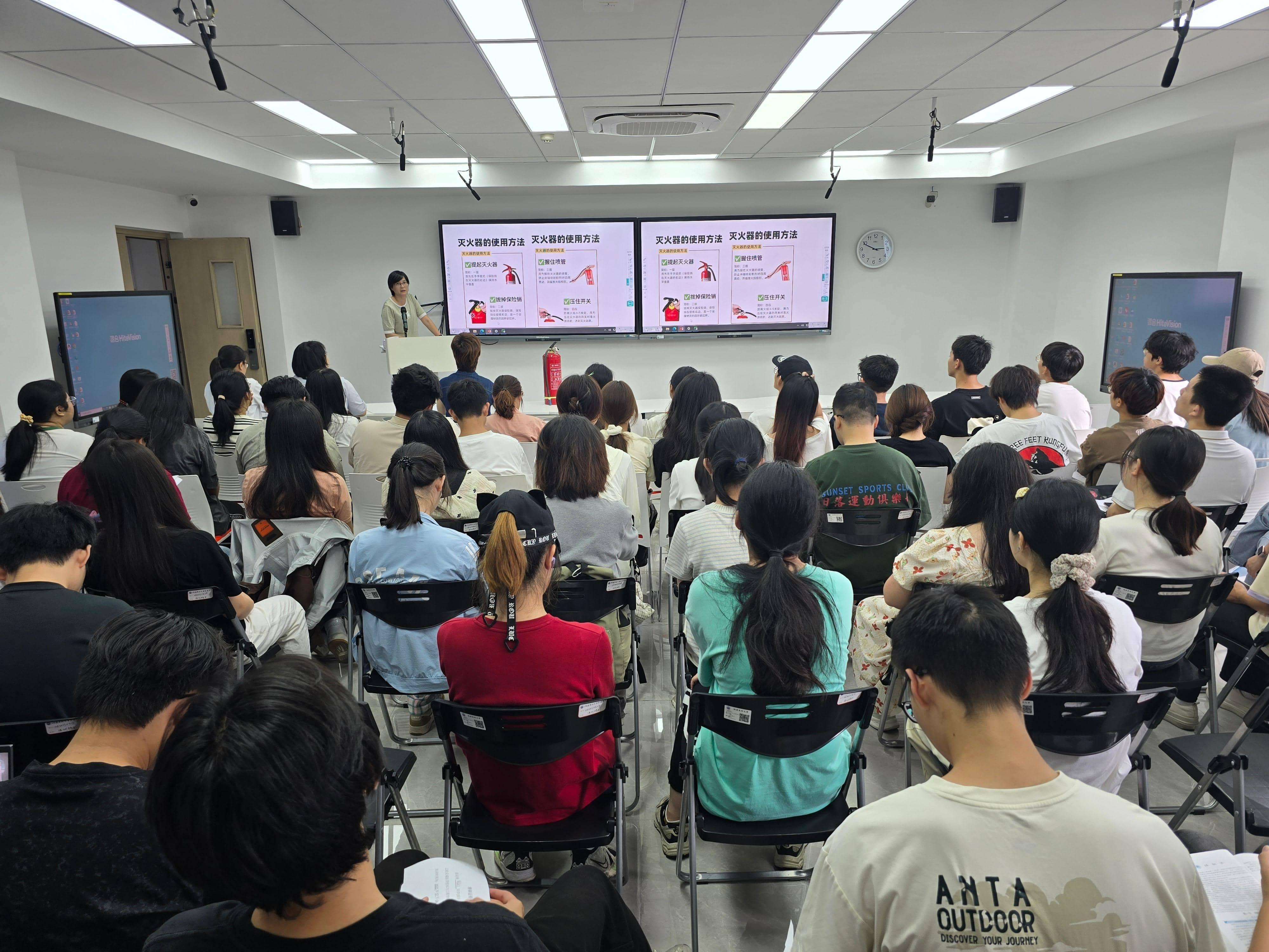 培训会上,党政管理办公室主任余燕针对校内常见的消防安全问题,为学生作了一场深入浅出、富有启发性的消防安全讲座,并现场示范了灭火器的正确使用方法。